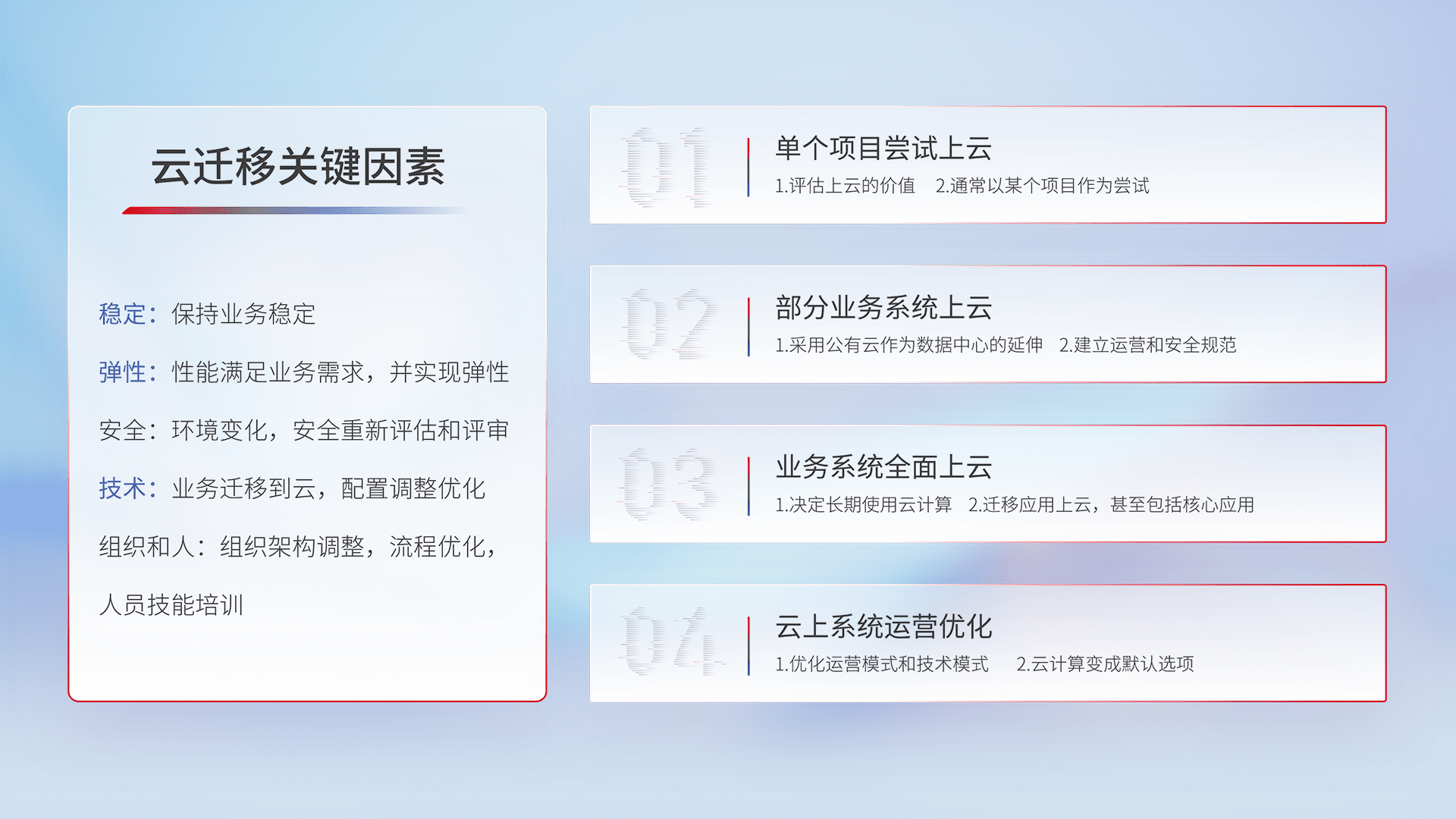 结合实际业务,,从规划设计、、、云平台选型、、、云原生改造、、、、数据迁移、、、集成交付,,,,迁移全过程为客户识别最佳上云路径,,做好风险识别管理,,设计网络架构、、、身份权限、、、、安全审计合规、、操作审计、、日志审计、、监控告警策略、、、、多站点容灾设计等,,,对云上基础设施进行整体规划,,,提升IT治理水平,,,,以满足弹性、、高可用、、、高性能的需求。。。。
