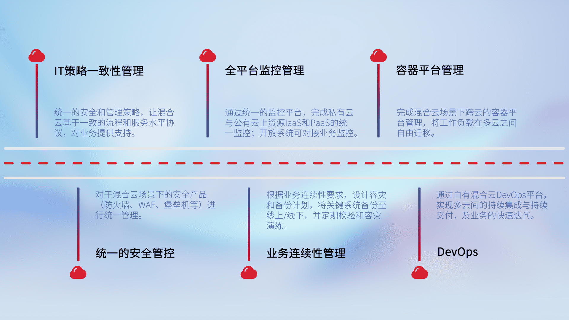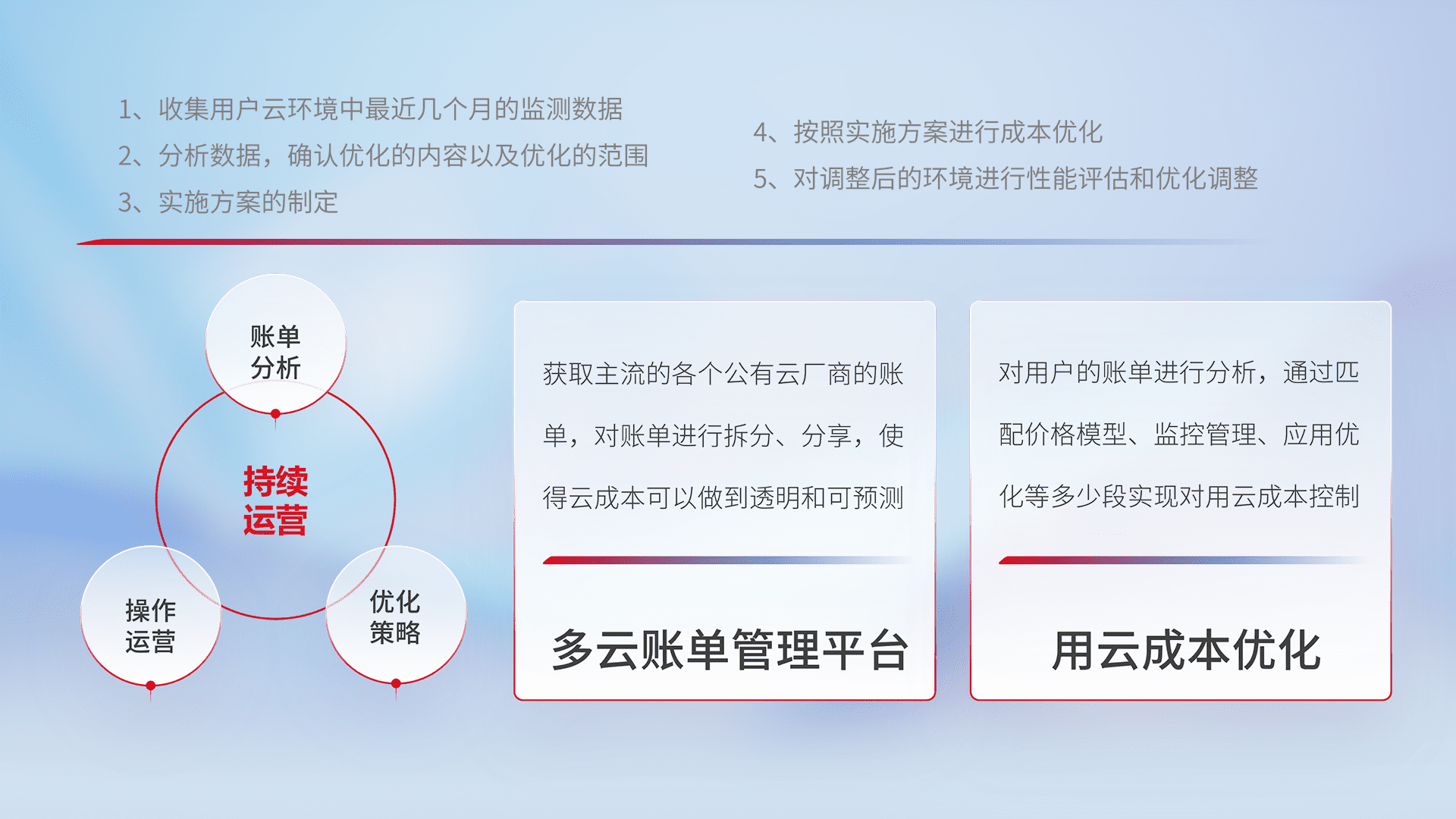 通过多云纳管,,以统一的资源数据模型把客户的云资源进行抽象和封装,,进而实现对多云资源的统一操作,,,,保障云资源管理的可靠性、、、稳定性与可用性。。。。量身定制化运维内容,,配置、、、开发运维、、、、补丁管理、、、备份、、、、监控、、、认证和访问管理、、、、审计和日常巡检等,,保障在用云过程中的可靠度,,,,稳定度以及高可用率。。。